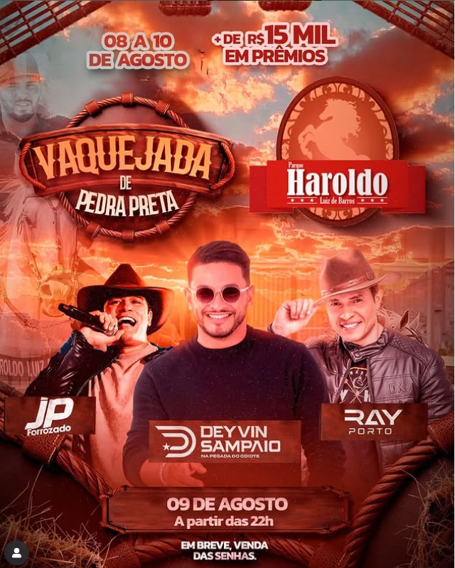 O forró do sábado ficará por conta das atrações: Deivyn Sampaio e Pegada do Coyote, Ray Porto e JP Forrozado.