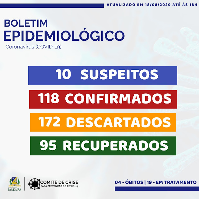 Mantendo a transparência e as informações a toda a população, a Prefeitura Municipal de Jandaíra, através Secretaria Municipal de Saúde, informa neste dia (18), atualização dos casos de COVID-19 no município de Jandaíra.