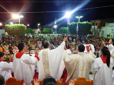 A Santa Missa teve inicio com a presidência do Pe. José Roberto da Rocha, o Pe. Zezinho, que fez a abertura e a benção da cadeira presidencial e das auxiliares, para o altar, presente de Luiz de Haroldo, prefeito de Pedra Preta. Logo após esse momento, o Pe. Zezinho passou a presidência da celebração para o Pe. Manoel Alaíde, que foi muito feliz em suas palavras, quando convocava a comunidade para viver essa festa como um grande retiro, dez dias para renovar a fé.