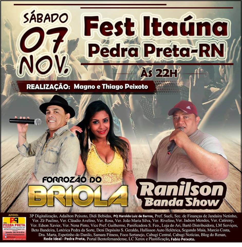 Depois do sucesso que foi a festa com Rodrigo Leal, o fenômeno romântico do momento, o Itaúna Fest e Recepções em Pedra Preta se prepara para outra grande festa, dessa vez com Forrozão do Briola e Ranilson Banda Show no dia 07 de Novembro.