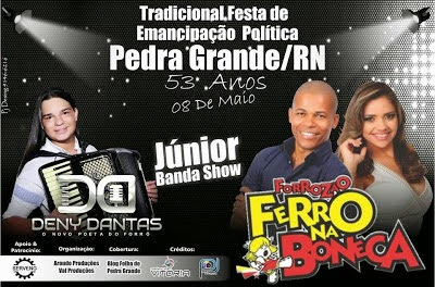 No próximo dia 08 de maio acontece a tradicional festa de emancipação política de Pedra Grande, grandes atrações como Forrozão Ferro na Boneca, Deny Dantas e Júnior Banda Show animarão os festejos.