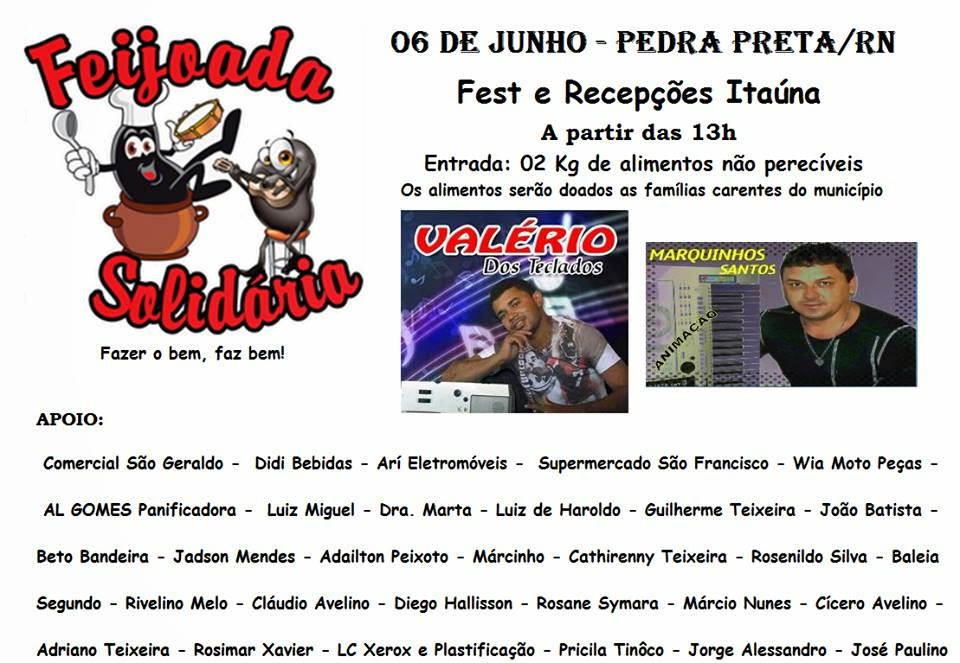 No dia 06 de Junho, o Fest e Recepções Itaúna em Pedra Preta será sede da I Feijoada Solidária. O evento é uma idealização de um grupo de jovens e tem como objetivo ajudar as famílias carentes do município.